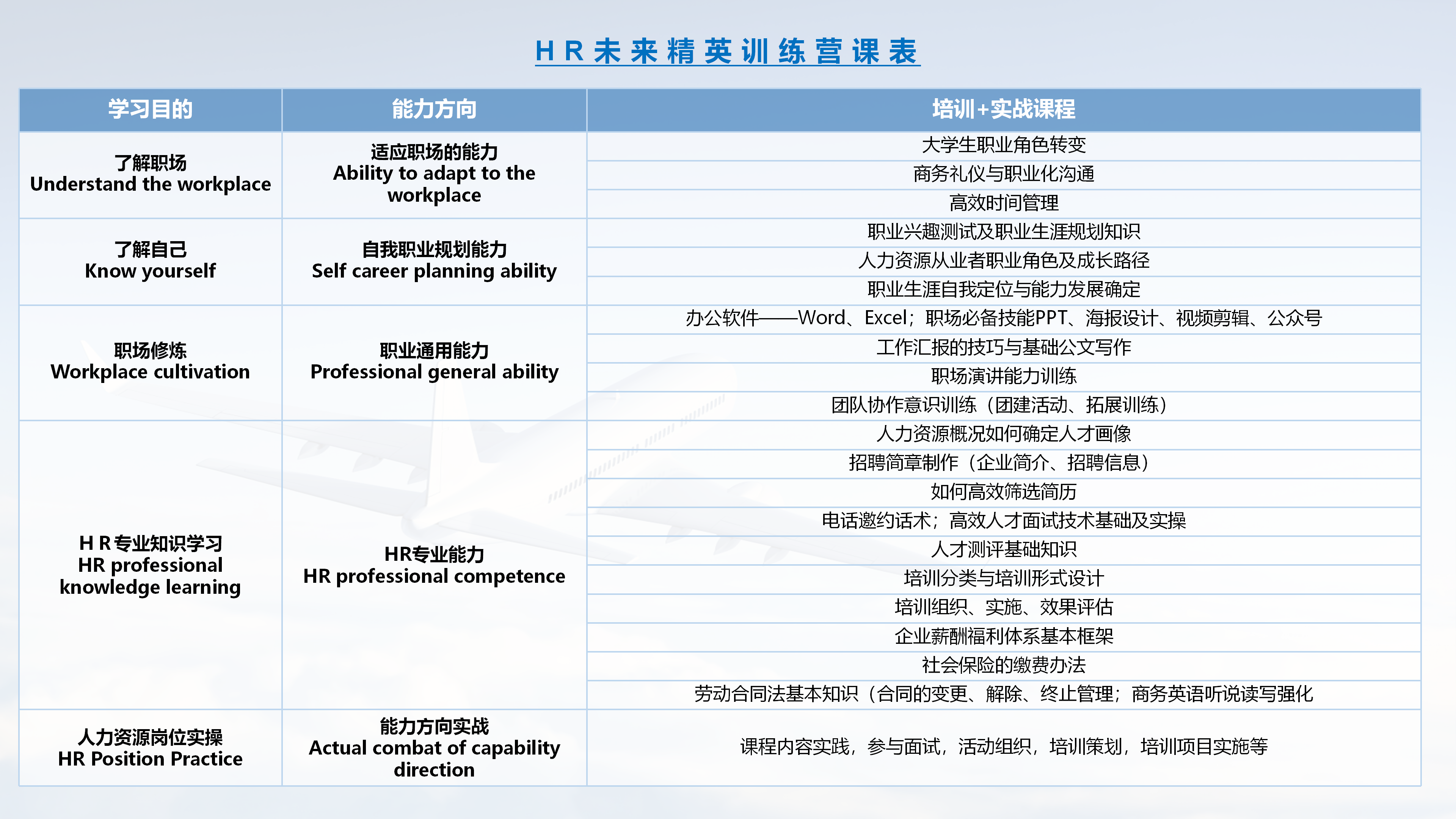 智博合悦业务型HR体系课程是联合由知名企业多年经验的人力资源总监和国内知名讲师打造,根据工作经验分为未来精英训练营(大学生/职场小白)、懂业务的HR训练营(1-3年经验)、HR公益训练营(3-5年经验)和业务型HR训练营(HR经理级)四个训练营。 体系化的课程和实力讲师团队助力学员成为真正懂业务的HR,真正成为业务的伙伴。