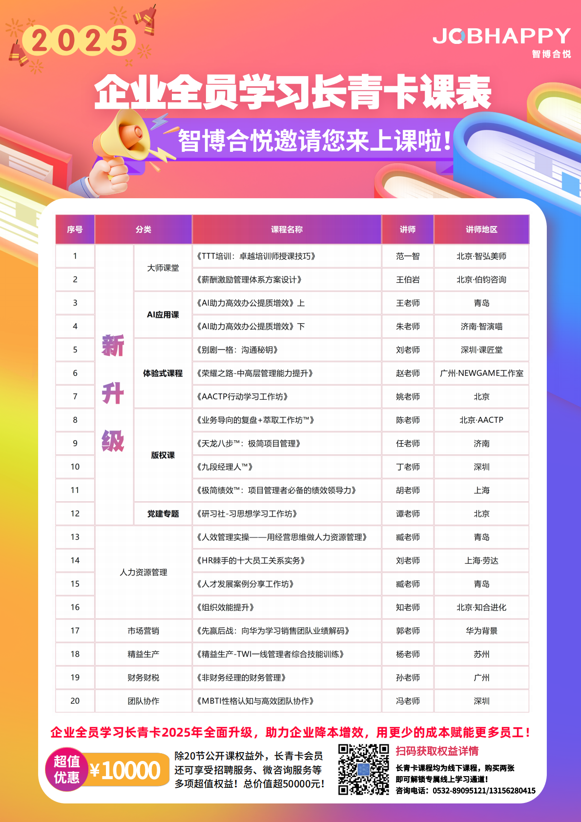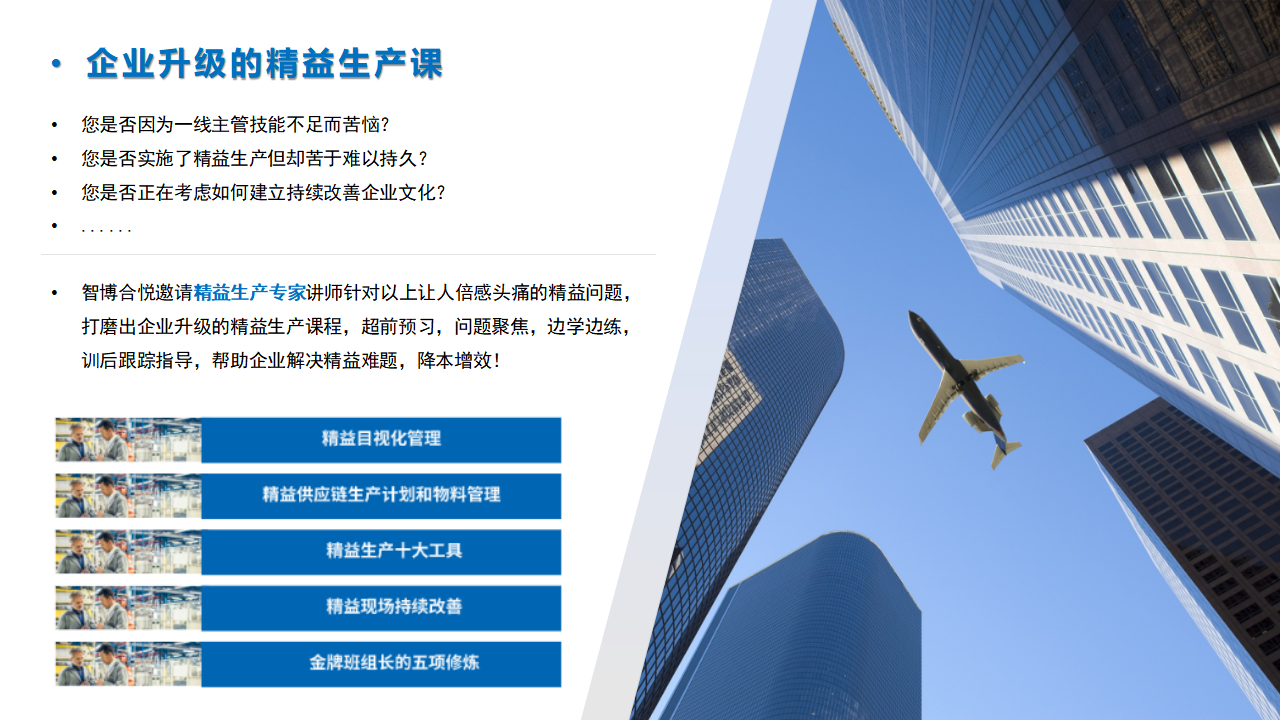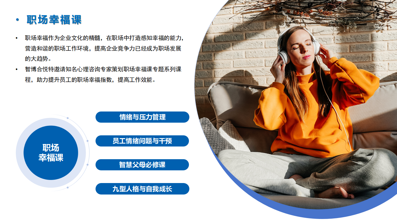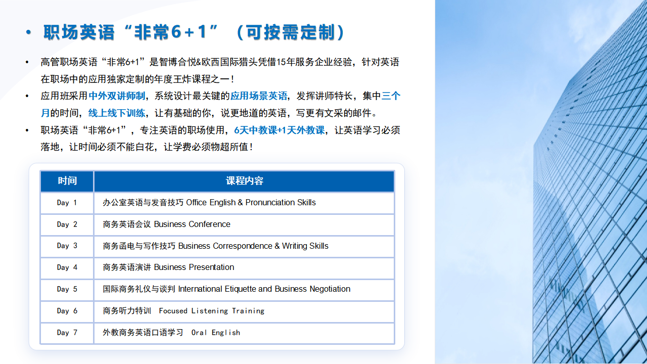 智博合悦结合16年人力资源服务经验,基于企业端的学习需求,2025年推出多项特色课程:职场英语“非常6+1”(中外双讲师+职场应用英语+可按需定制)、AI助力办公 (AI与办公软件结合,提升办公绩效)、 职场幸福课(提升幸福指数,提高工作效能)、企业升级的精益生产课(问题聚焦,降本增效)等课程。
